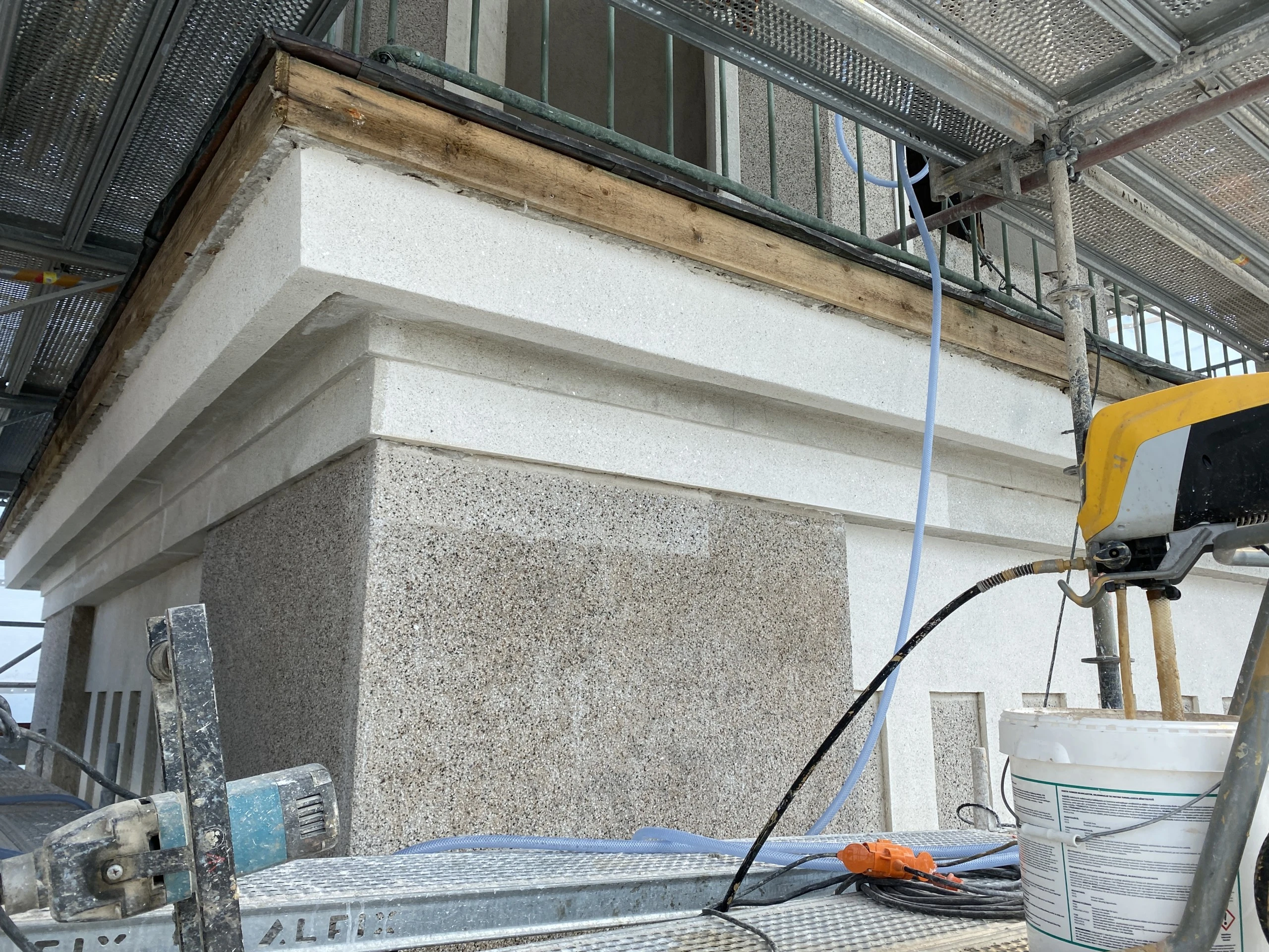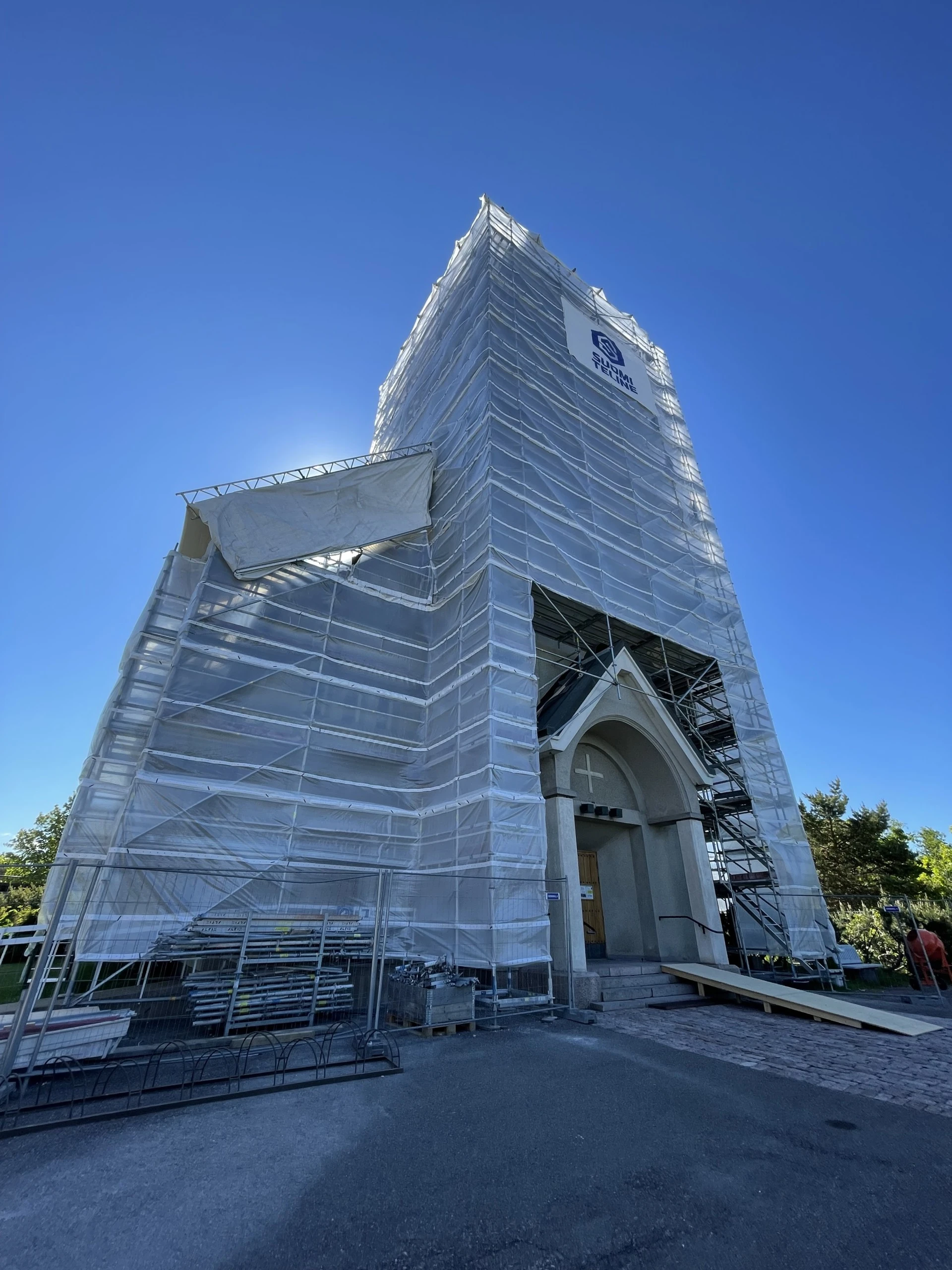 Hangon kirkon julkisivun ja vesikaton saneeraus sisälsi kirkontornin ja porrashuoneiden julkisivun paikkarappauskorjauksen ja siihen liittyvien pellitysten sekä varusteiden saneeraustyön sekä kirkkotornin etelän puoleisen porrashuoneen vesikatteen uusimisen.