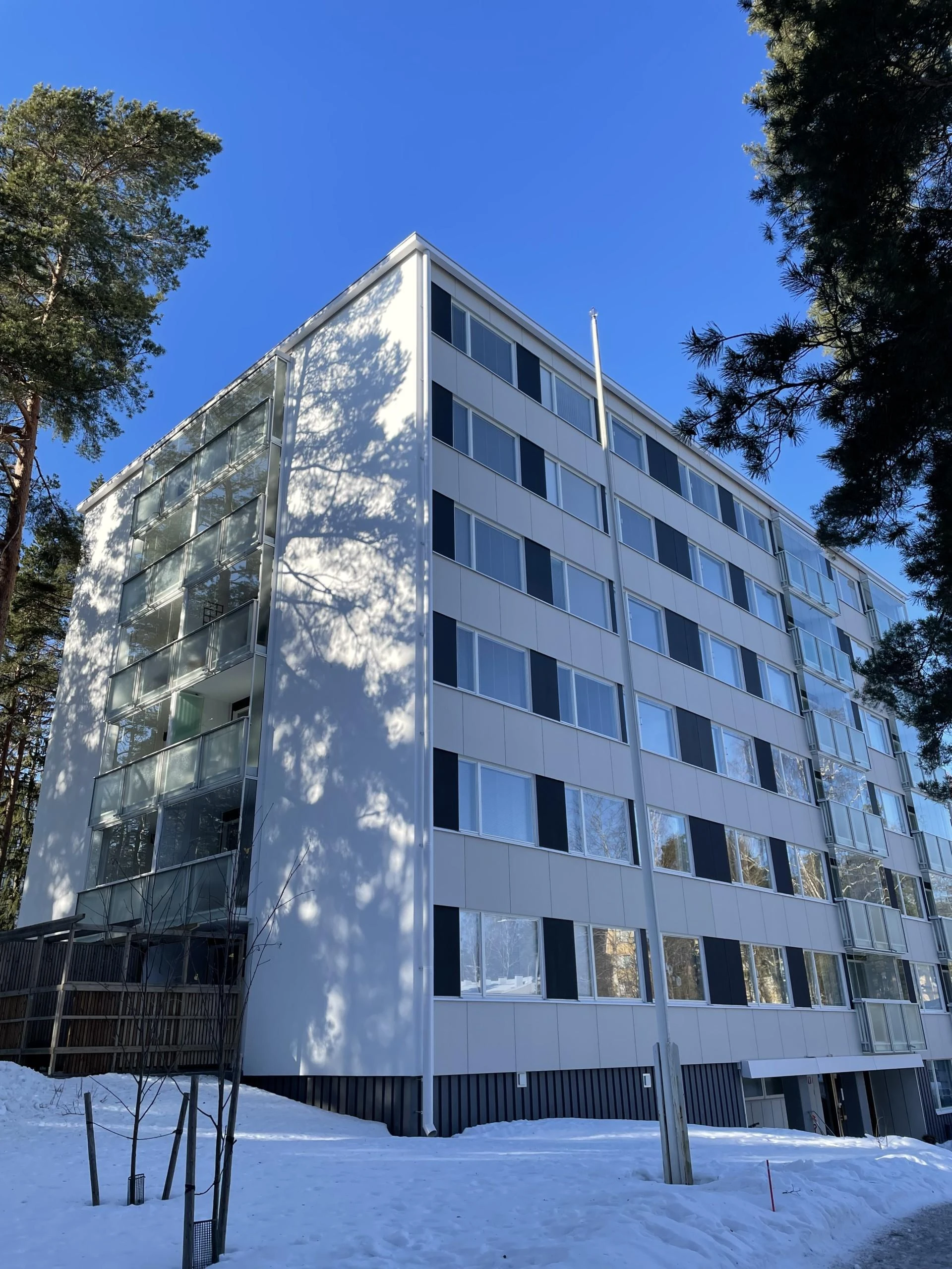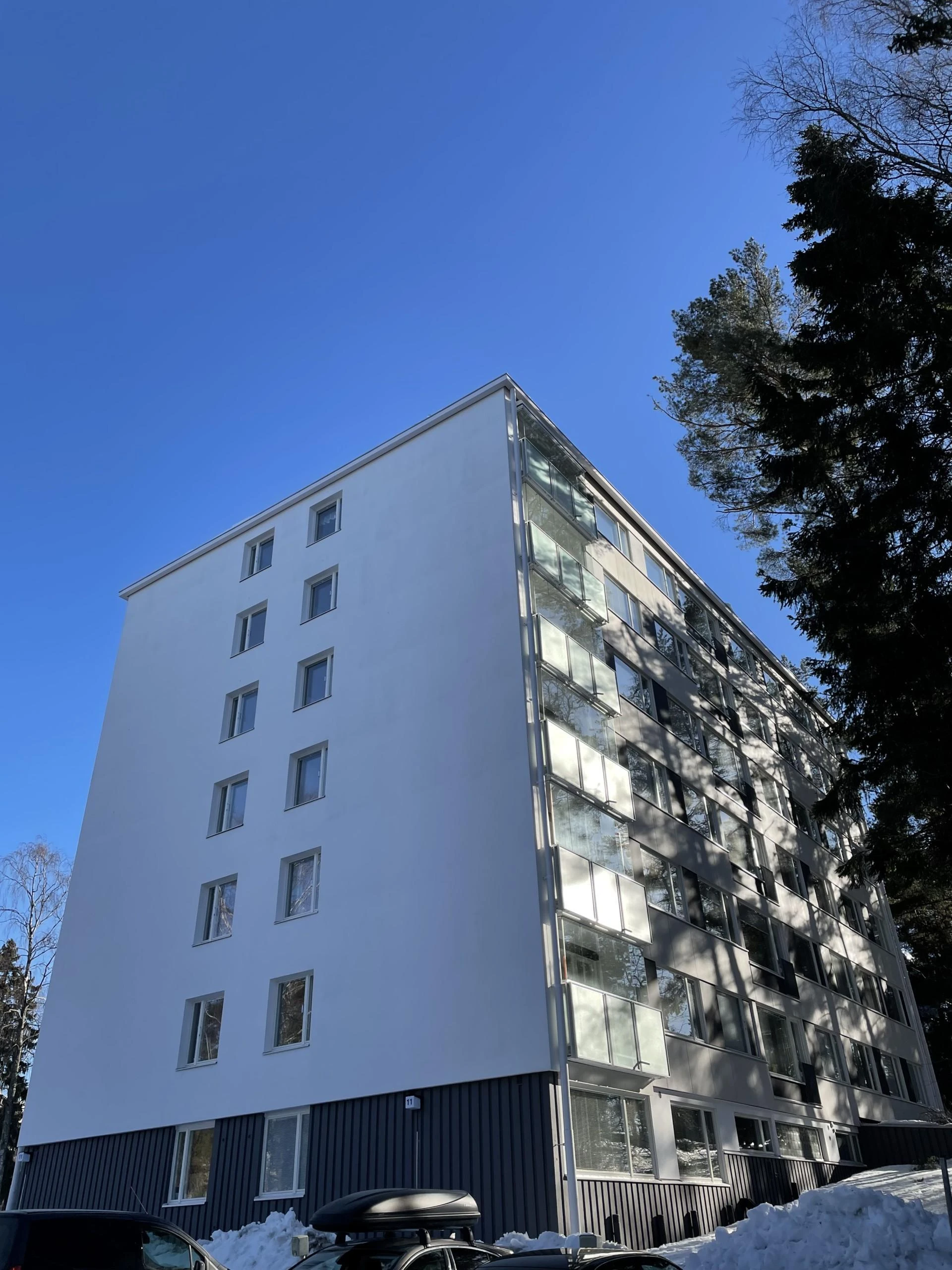 Aarno toimi rakennesuunnittelijana, projektinjohtajana sekä valvojana Tapiolassa sijaitsevan yhtiön ulkovaipan saneeraushankkeessa. Saneerauksessa uusittiin päätyjulkisivujen rappaukset ja lämmöneristeet sekä pitkien julkisivujen levyverhoukset ja lämmöneristeet. Päätyjulkisivujen rappaus toteutettiin levyrappausjärjestelmällä. Kaikkien huoneistojen ikkunat uusittiin, parvekkeiden ovet uusittiin sekä kaiteet kunnostettiin ja maalattiin. Myös yleisten tilojen ikkunoita ja ovia kunnostettiin ja uusittiin. Urakkaan kuului myös vesikaton uusiminen lisälämmöneristämisellä. Muita liittyviä töitä olivat mm. vesipellitysten ja kaikkien liitoslistojen uusiminen sekä betonisokkeleiden pesu, betonipaikkauskorjaus ja huoltomaalaus.
